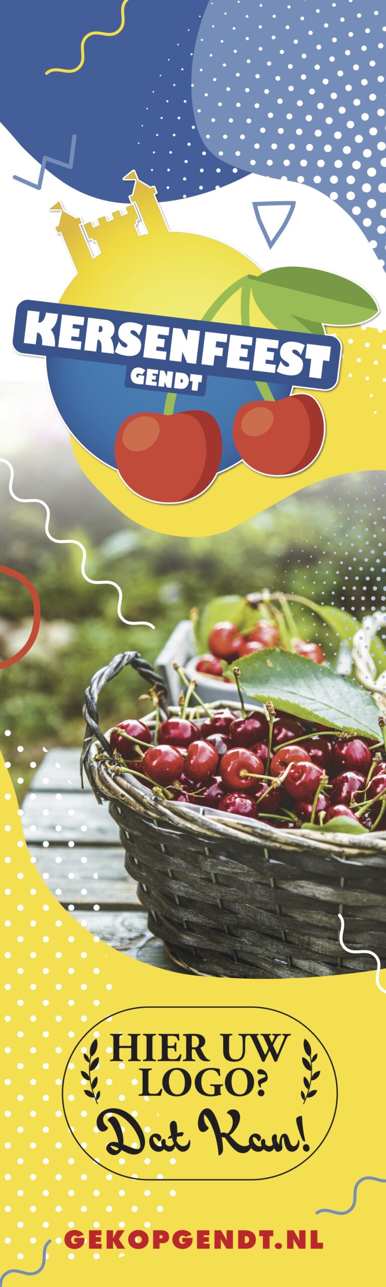 Banieren voor een periode van 5 jaar opgehangen aan een lantaarnpaal in de Dorpstraat gedurende het gehele weekend. Uw logo komt op de plaats van het ‘Gek Op Gendt’ logo. Hieronder wordt de website van het Kersenfeest vermeld.